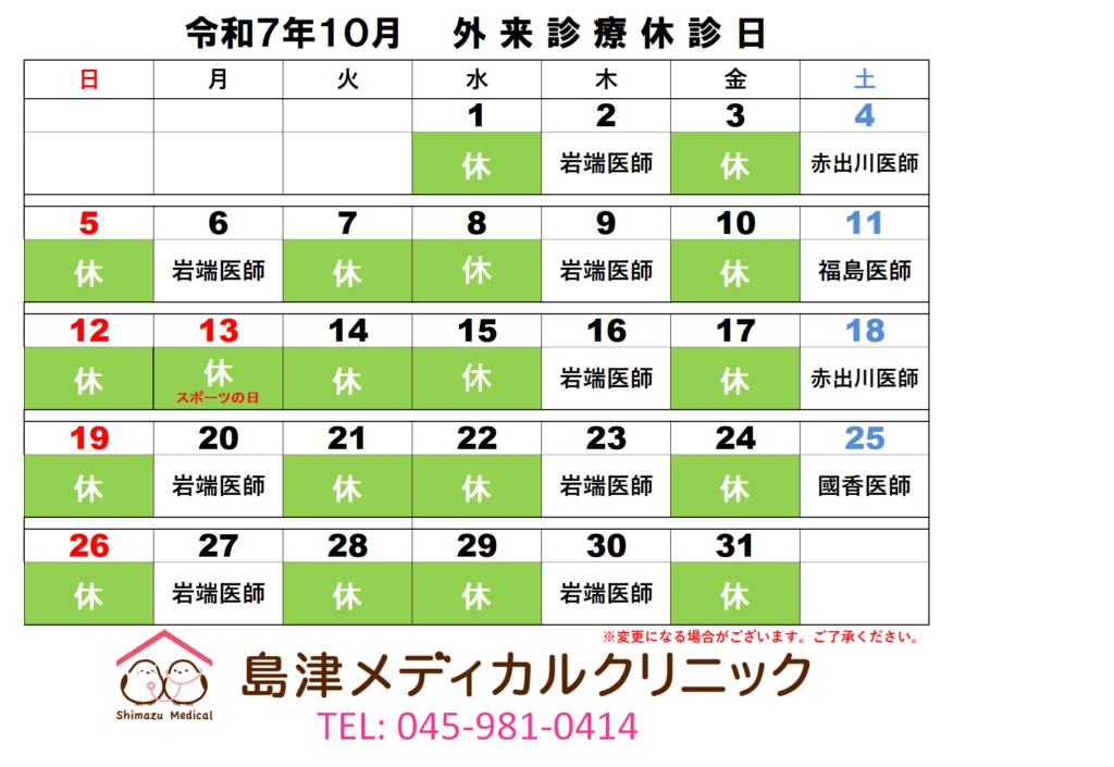 令和7年10月 外来診療予定表 2025/10/14 お知らせの更新が滞っており大変申し訳ございませんでした。 外来の予定をお知らせいたします。 なお、土曜日の外来担当医が変更となっております。 第1・第3土曜日:赤出川医師 第2土曜日:福島医師 第4・第5土曜日:國香医師 よろしくお願い申し上げます。