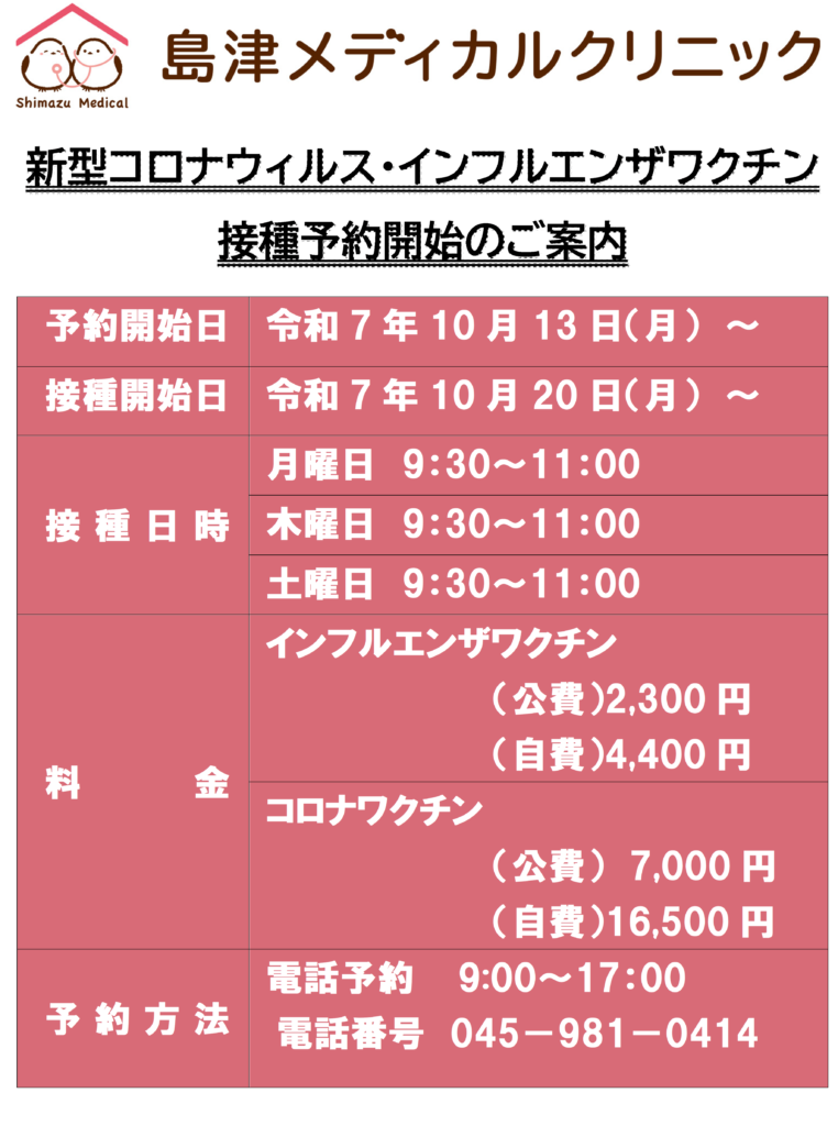 インフルエンザ・新型コロナウイルス予防接種について 2025/10/14 予防接種の予約受付を開始しております。 接種開始は2025年10月20日(月)です。 外来診察時間内での接種となります。 完全予約制となりますのでご希望の方はお電話にてお問い合わせください。